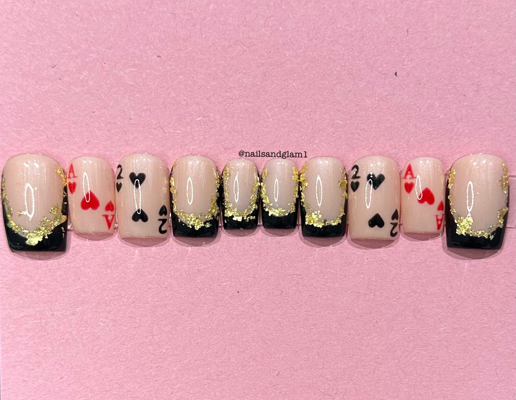 Black French Tips with Gold Flakes & Playing Cards | Press on Nails UK | Stick on Nails | Reusable | Customised | Handmade | Set of 10