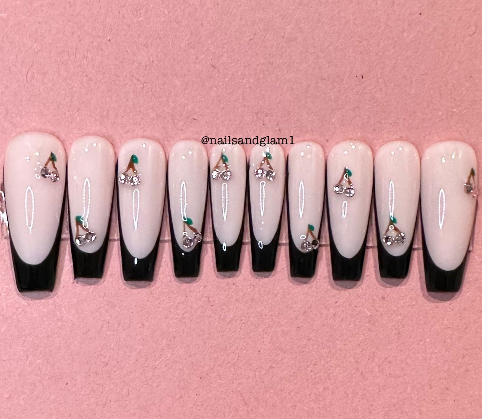 Black French Tips with Pink Cherry Rhinestones | Press on Nails UK | Stick on Nails | Reusable | Customised | Handmade | Set of 10