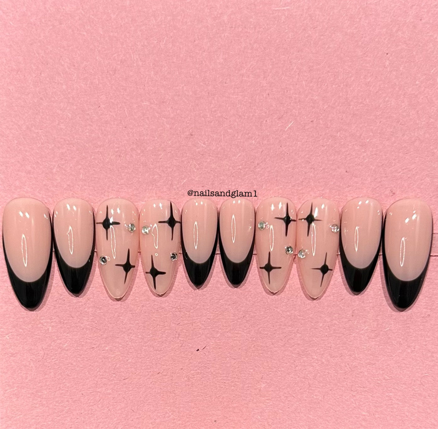 Black French Tips with Stars & Rhinestones | Press on Nails UK | Stick on Nails | Reusable | Customised | Handmade | Set of 10