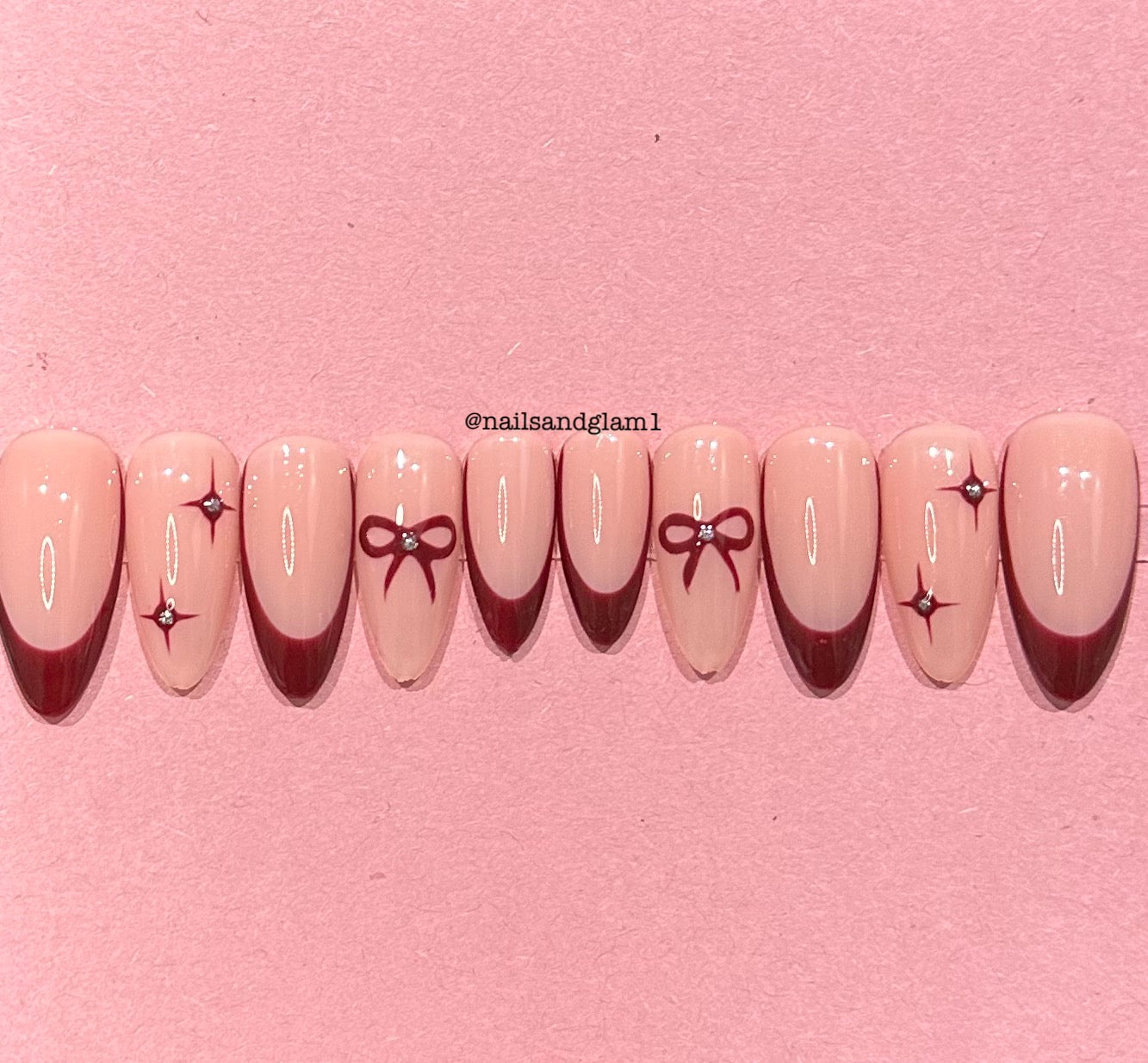 Maroon French Tips with Bows & Stars | Christmas Nails | Press on Nails UK | Stick on Nails | Reusable | Customised | Handmade | Set of 10