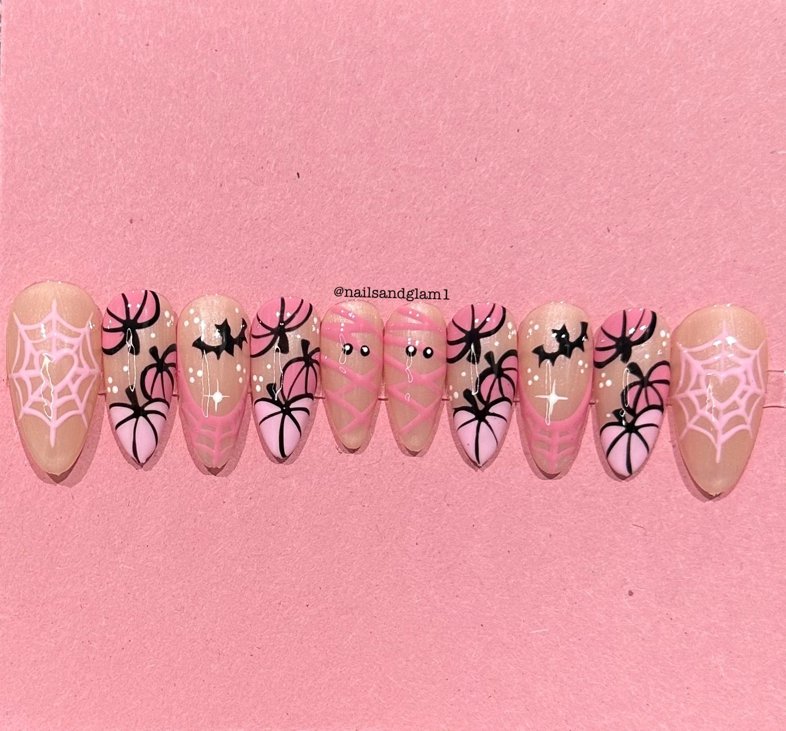 Pink Web & Pumpkin Nails with Stars | Halloween Nails | Press on Nails UK | Stick on Nails | Reusable | Customised | Handmade | Set of 10